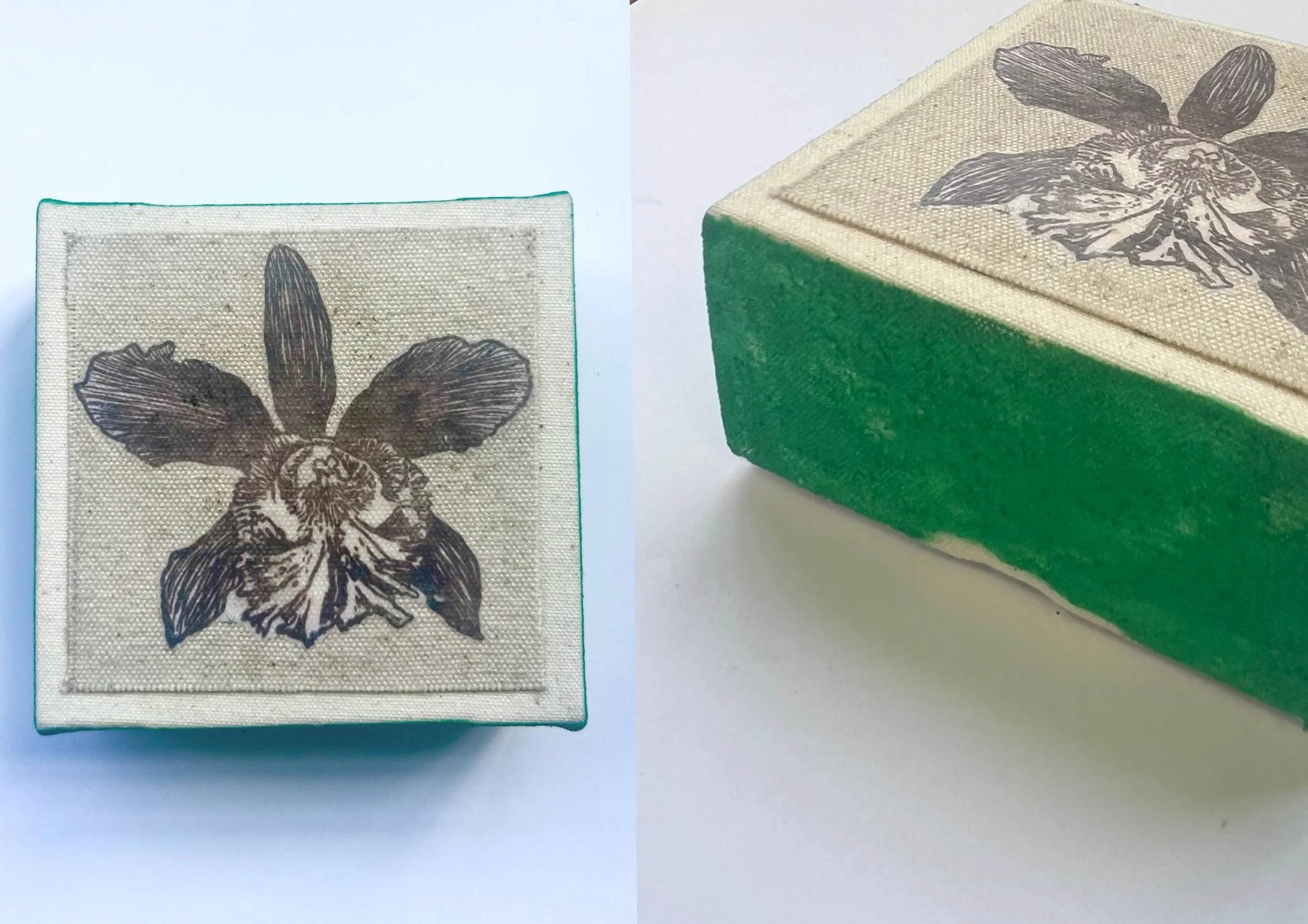 Ref. 04. Renata Fernandez, ORCHID, 2025, image transfer to canvas, 11 x 11 x 4 cm, edition of 2, number 1, signed at the back. Buy Now price £50