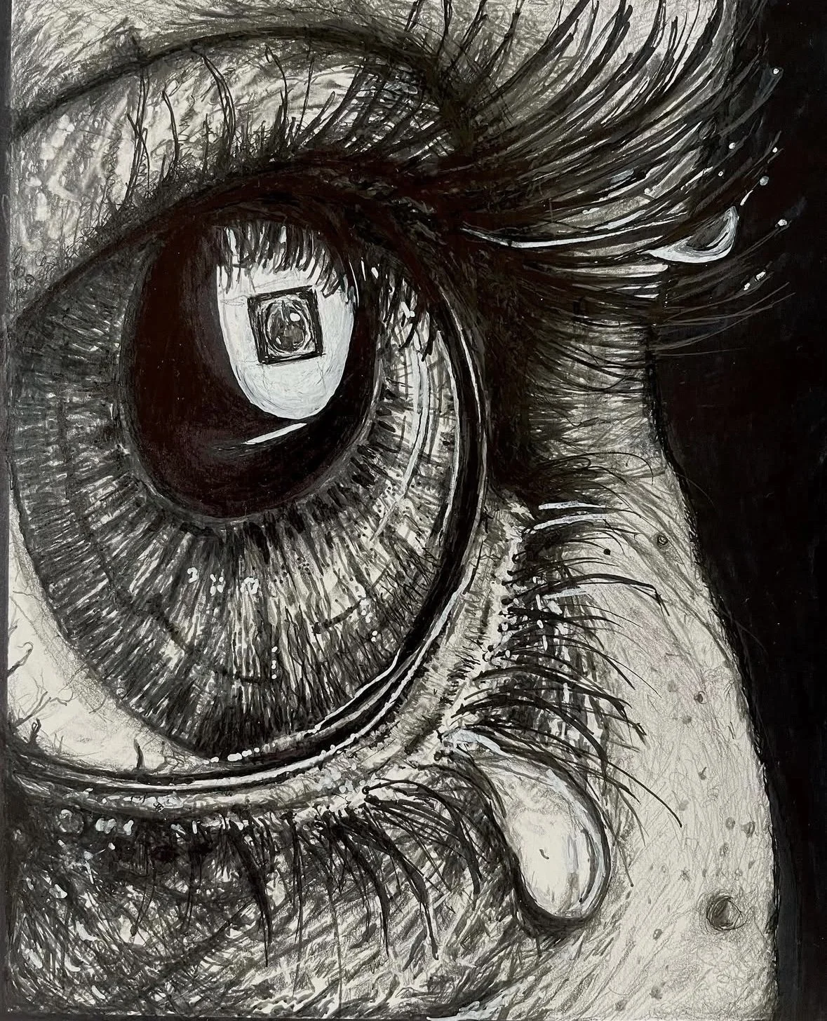 Ref.37. Holly Nerreter, Like tears in the Rain, mixed media ( pencil and paint and marker pen), 2023, 20 x 15cm. It was shown in the Saatchi Gallery Autumn 23 at the ArtGround Exhibition. Buy Now price £199