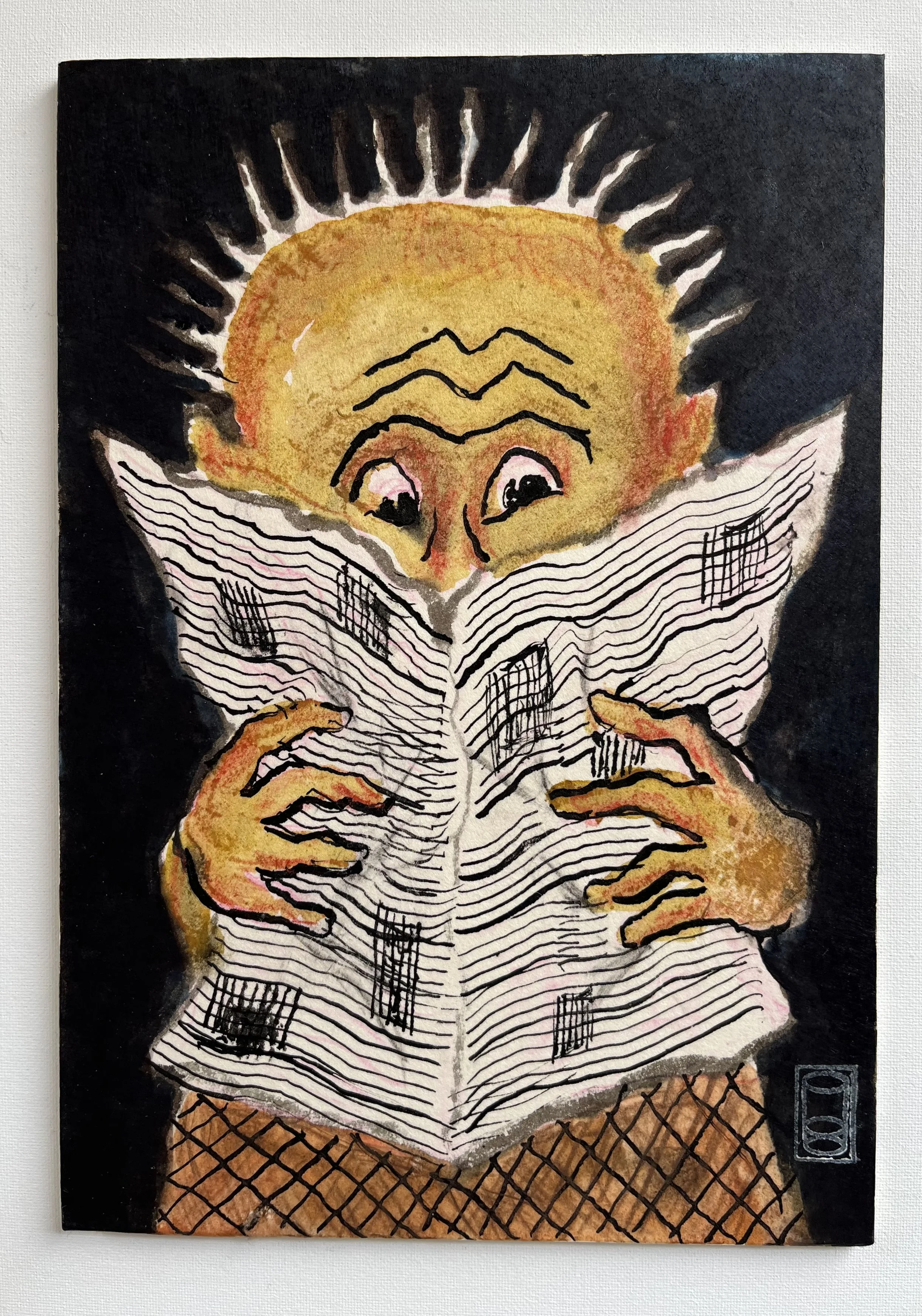 Ref.10. Peter Blegvad, News, 2024, ink, acrylic on paper mounted on card, 23 x 16cm. Buy Now price £50