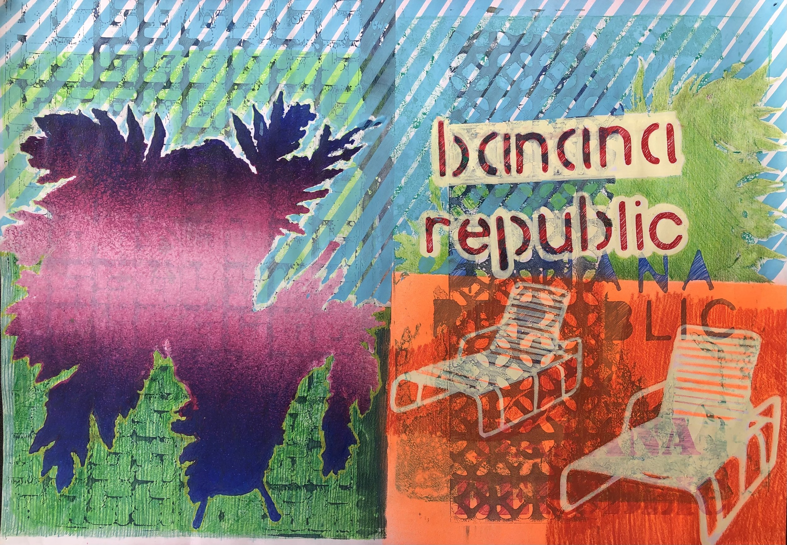 EM-Banana Republic 9, 2022, intervened mono print on paper, 30 x 42cm, unframed