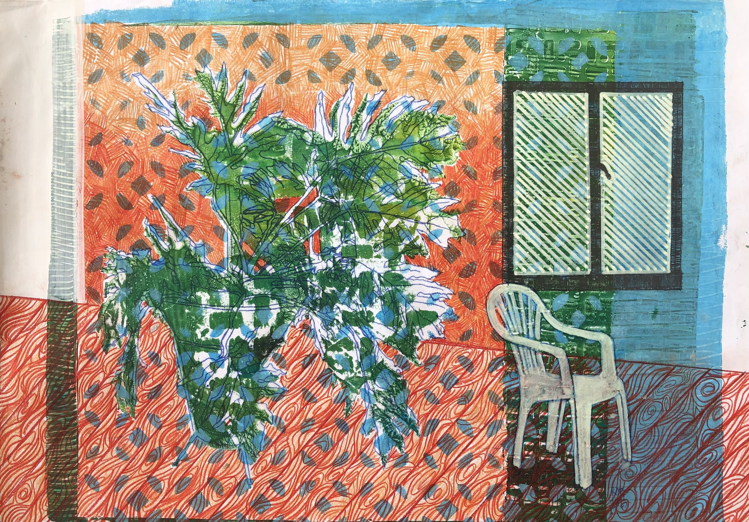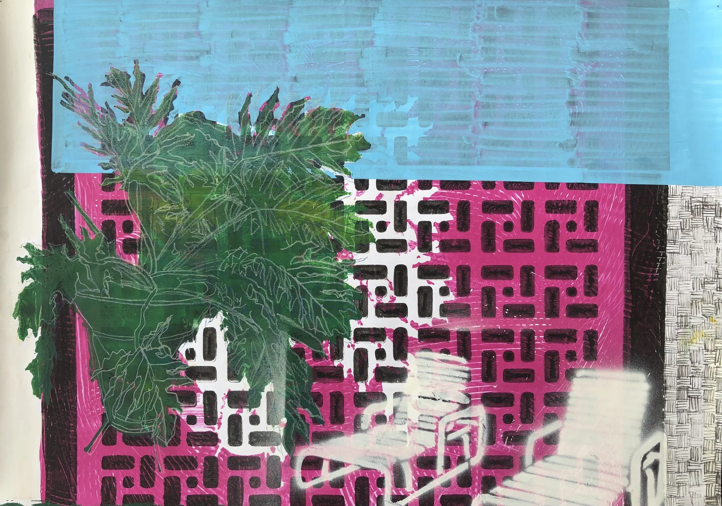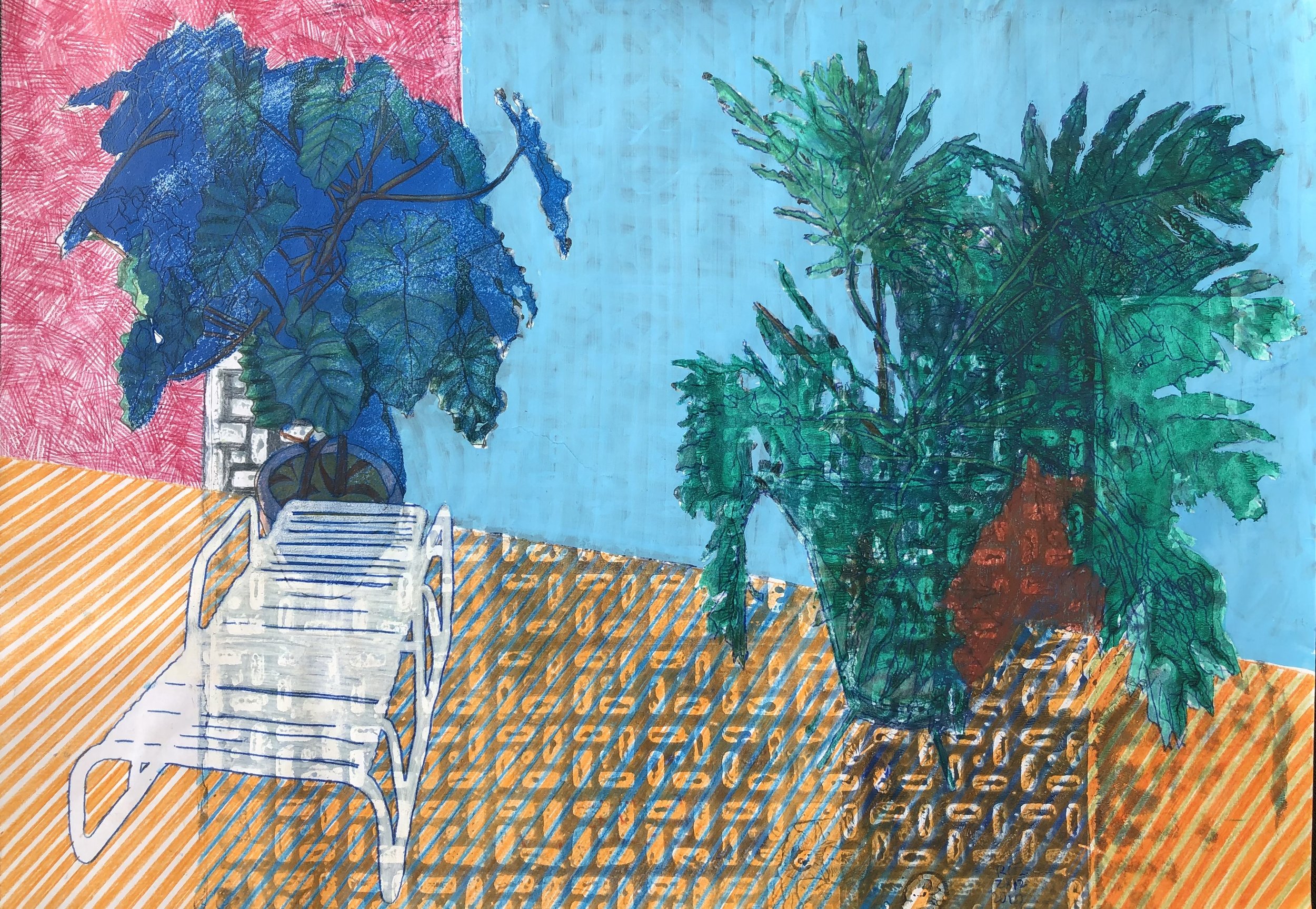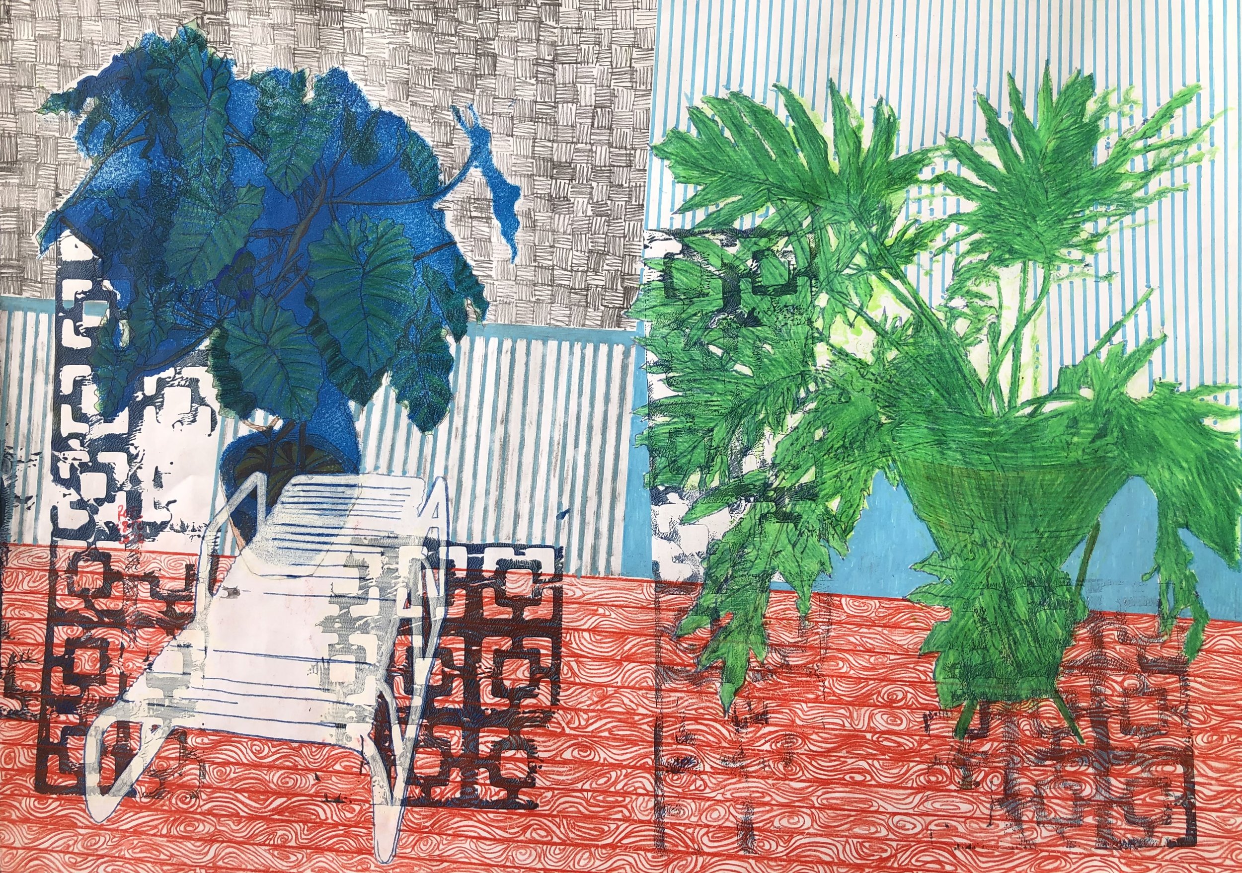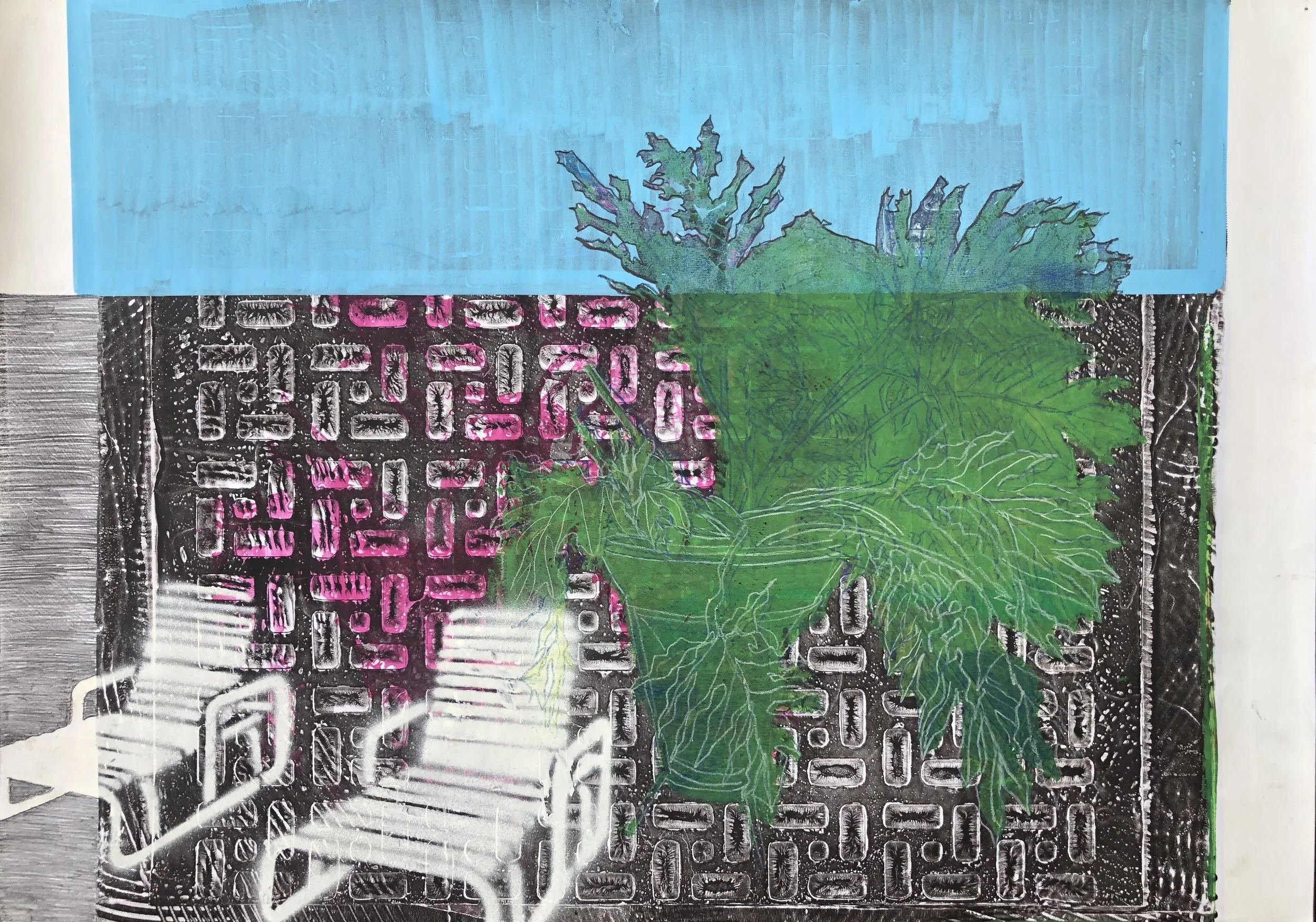 EM-2 House Plants-Varanda, 2022, intervened mono print on paper,