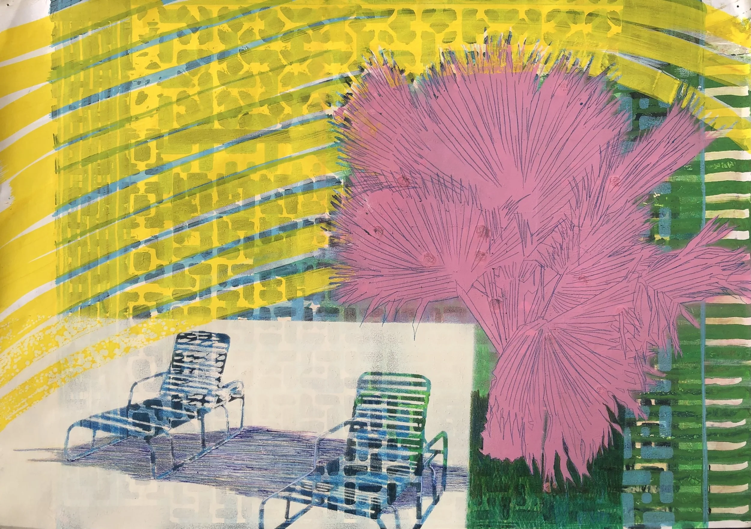 EM-2 Sunshine-Poolside, 2022, intervened mono print on paper,