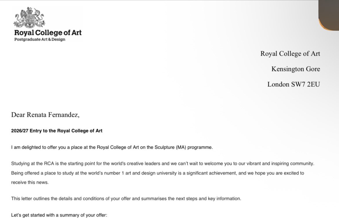 I am delighted to have been offered a place at the prestigious Royal College of Art MA Sculpture, starting September 2026.